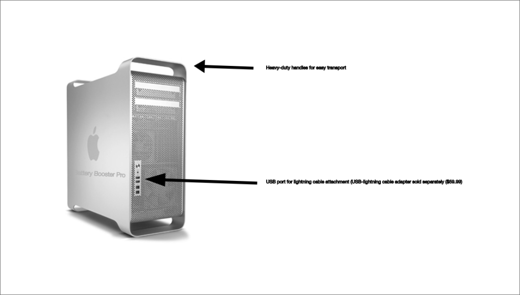 Battery Booster Pro: This heavy-duty option offers nearly all-day power. Built out of converted, refurbished Mac Pros, the new Battery Booster Pro features Apple’s iconic computer tower silhouette, while combining extremely functional handles that can be used to transport your battery-power boosting technology to anywhere you might be going. It can be carted around by two people taking either handle, or by one person grabbing onto both handles and waddling slowly like an obese penguin with an unbalanced gait. You can get your Battery Booster Pro for the low price of $2,500, in addition to its necessary components (wall charger, $150.00), Battery Booster Lightning Cable ($45.00), or standard Lightning Cable ($19.00). You can also get a heavy-duty extension cable for outdoor use ($250.00).