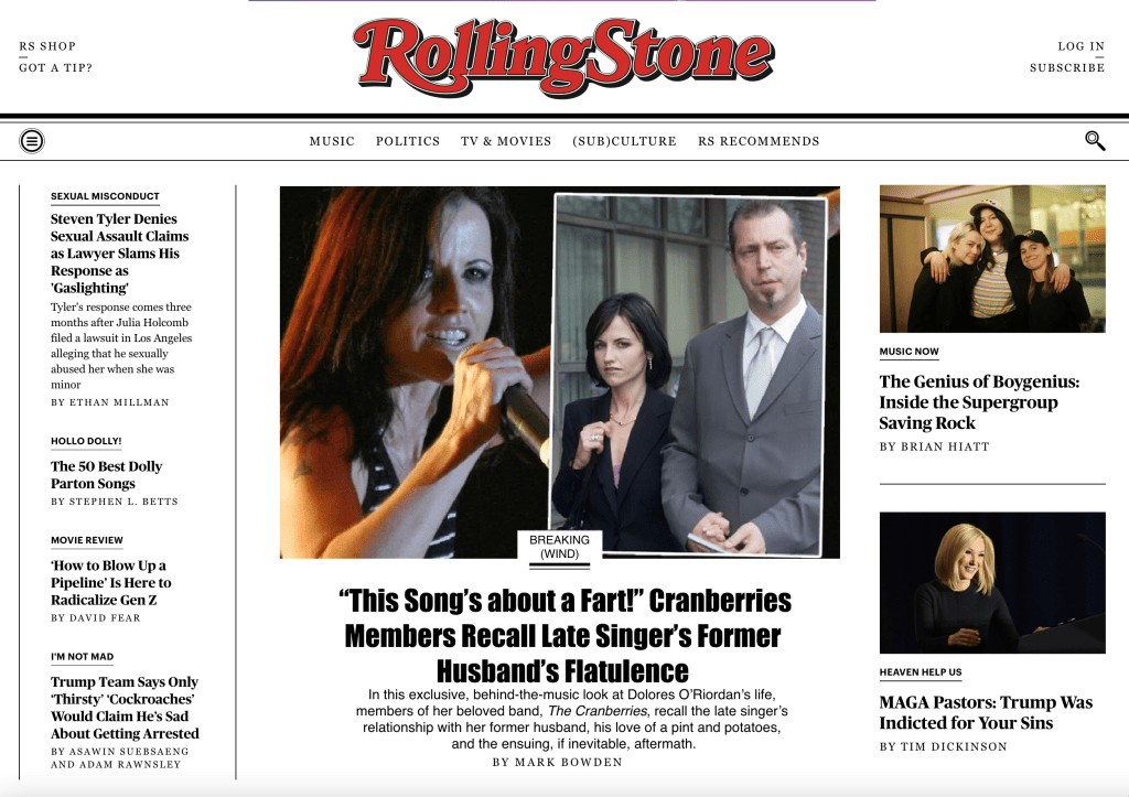 THE CHARMING ISLAND OF IRELAND—Rolling Stone, a prestigious music journalism magazine, today broke a heartwarming, if exceedingly smelly, story titled “‘This song’s about a fart!’ Cranberries members recall late singer’s former husband’s flatulence.” The song in question, “Linger,” and its echoing plea—“Do you have to, do you have to, do you have to let it linger?”—reportedly were written by the Dolores O’Riordan to describe the strained relationship with her former husband, music manager Don Burton. On occasion, O’Riordan would quietly murmur that resounding plea as the couple lie in bed in the early Irish mornings following a night her then-husband had visited the pub, drank heavily into the night while in merriment among mates, and consumed copious servings of potatoes. “It smelled really bad, rank,” lead guitarist Noel Hogan told Rolling Stone journalists how O’Riordan described the situation then. “She told me sometimes he’d let out a squeaker when poor Dorrie was under the covers,” describing a phenomenon known in the Dutch language as an “oven.”