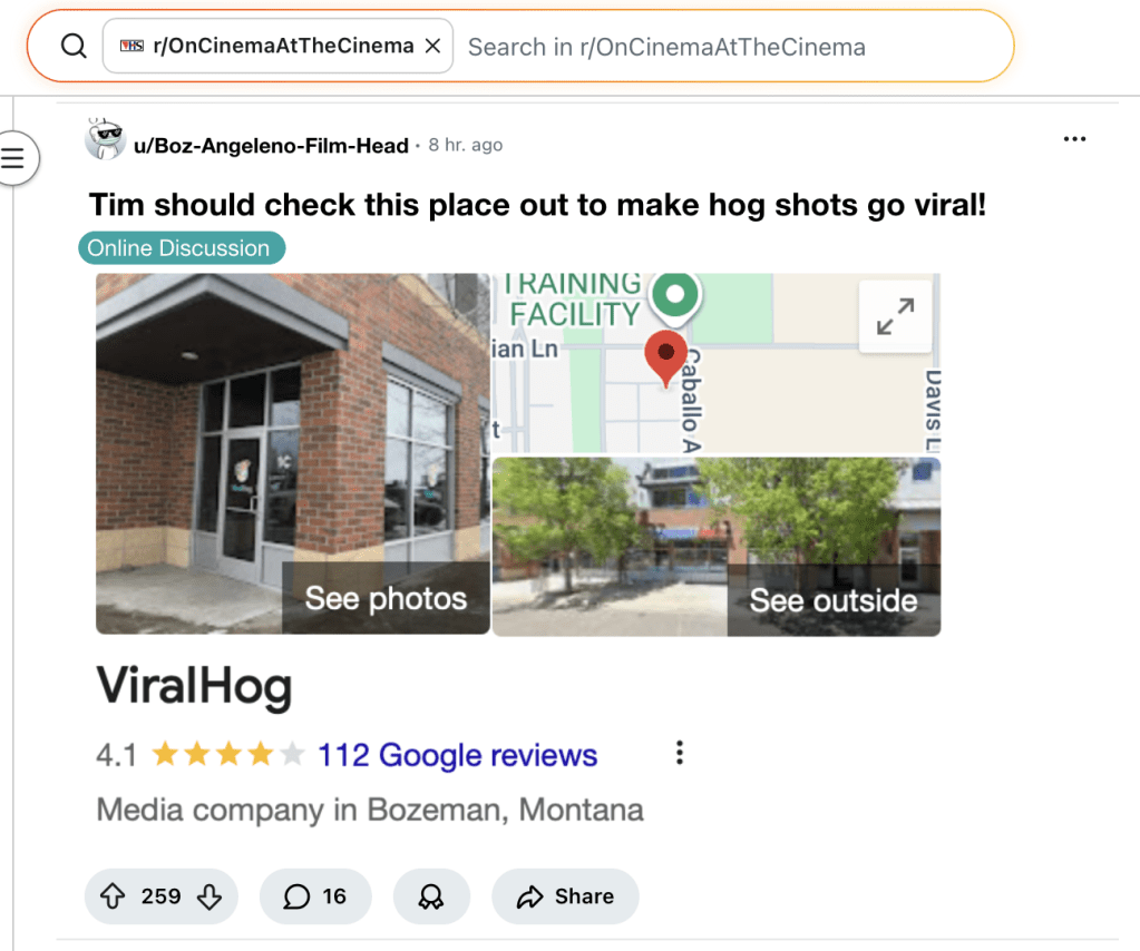 “I want you to make my Hog (Shots) go mega viral, and can you help me get in contact with Tom Cruise?” Tim had apparently told the ViralHog marketing team, apparently viewing the “Viral” and “Hog” a good synergistic match between Heidecker’s business projects and ViralHog’s services – but he was nonetheless surprised, and a little disappointed, not to see many examples of viral motorcycle videos or literal hogs in the company’s reel. The “hog” was really just part of their logo, the company explained.
